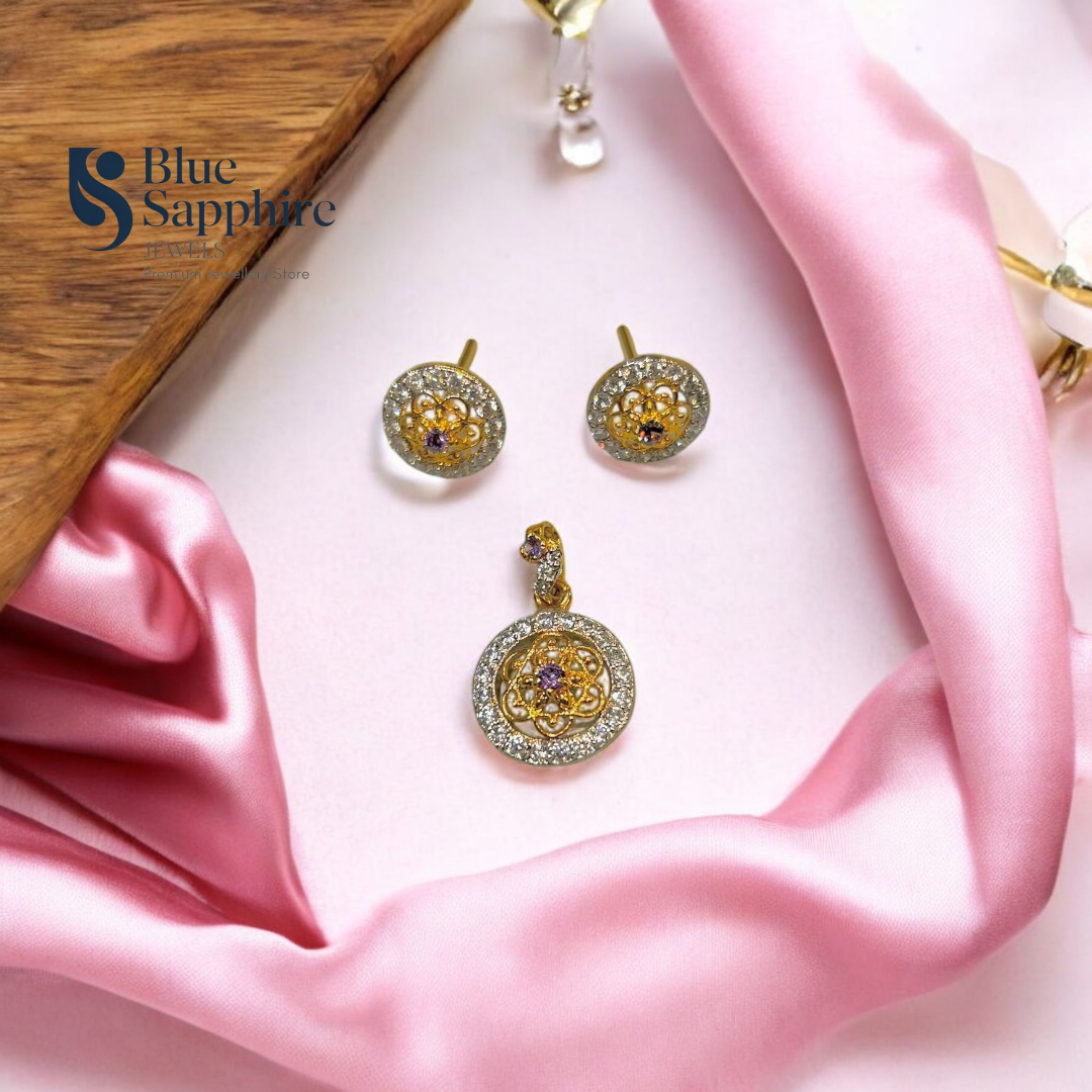 Elevate your elegance with this intricately designed gold-plated 925 silver jewelry set, featuring a stunning round motif accented with sparkling zircon stones and a captivating purple center stone. The delicate fusion of yellow gold and sterling silver offers a luxurious finish, perfect for both everyday wear and special occasions. The set includes a pair of studs and a matching pendant, crafted with precision to highlight timeless beauty and sophistication.