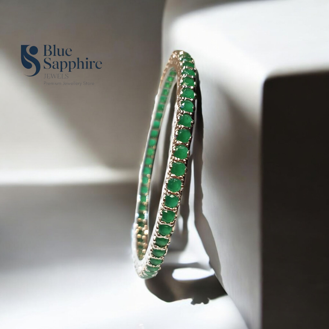 Step into timeless elegance with this stainless steel-plated 925 silver bangle, adorned with vivid green gemstones that evoke the richness of emeralds. Each stone is precisely set in a continuous line around the bangle, creating a seamless and sophisticated look.