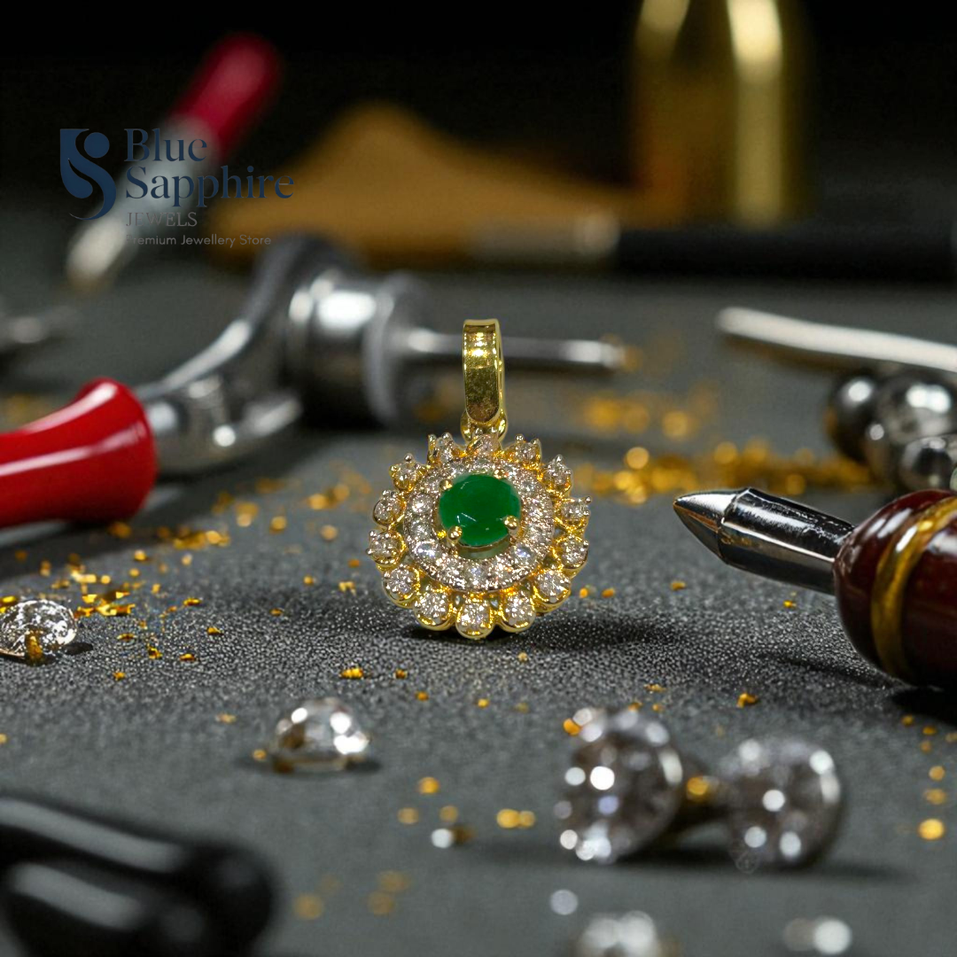 Make a radiant statement with our Emerald Bloom Pendant, a dazzling creation crafted in gold-plated 925 sterling silver. The centerpiece features a vibrant green stone surrounded by a sparkling halo of high-quality cubic zirconia, artistically set in a floral pattern. This pendant is a perfect symbol of elegance and timeless charm—ideal for everyday luxury or special occasions.
