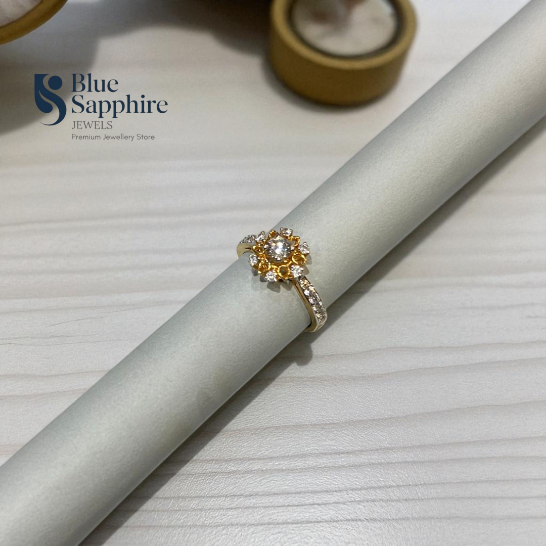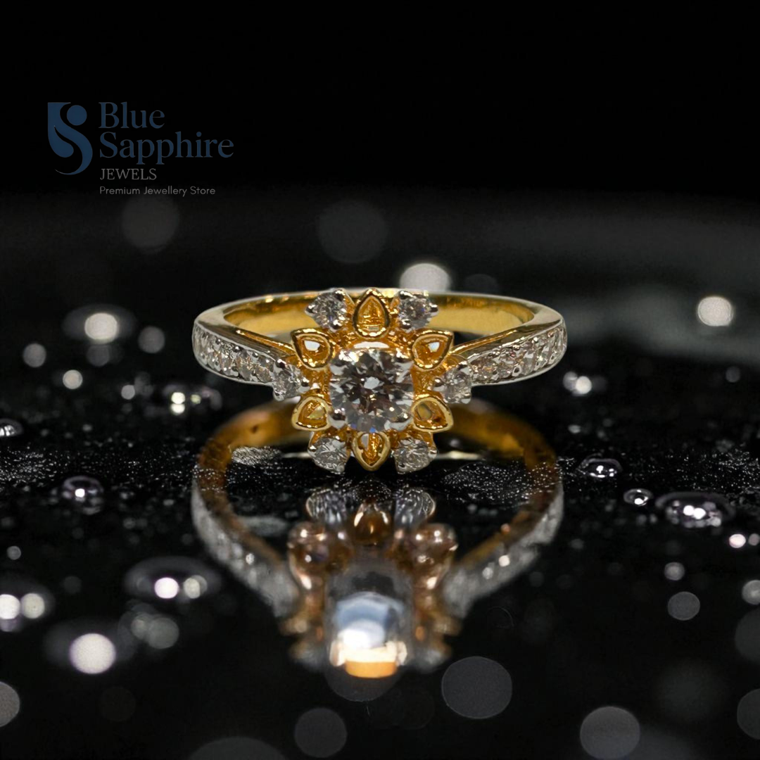 Radiate charm and elegance with this Floral Cluster Ring, exquisitely crafted in Gold Plated 925 Sterling Silver. The design features a sparkling round-cut zircon at the center, encircled by delicate petal-shaped accents and shimmering side stones that capture light beautifully. This ring combines the warmth of gold with the brilliance of premium zircons, making it a perfect statement piece for any occasion — from casual outings to evening events.