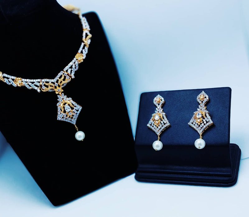 Gold Plated Necklace Set With americon Zircons And Hanging Pearls (925 Silver)