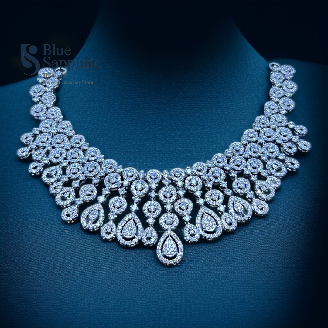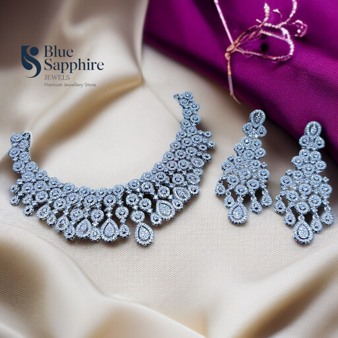 Elevate your special moments with this stunning 925 sterling silver bridal jewelry set. Designed with intricate detailing and premium-quality stones, the choker-style necklace paired with matching chandelier earrings adds timeless elegance to every look. Perfect for weddings, festive events, and grand celebrations. A luxurious blend of sparkle, sophistication, and craftsmanship from Blue Sapphire Jewels.