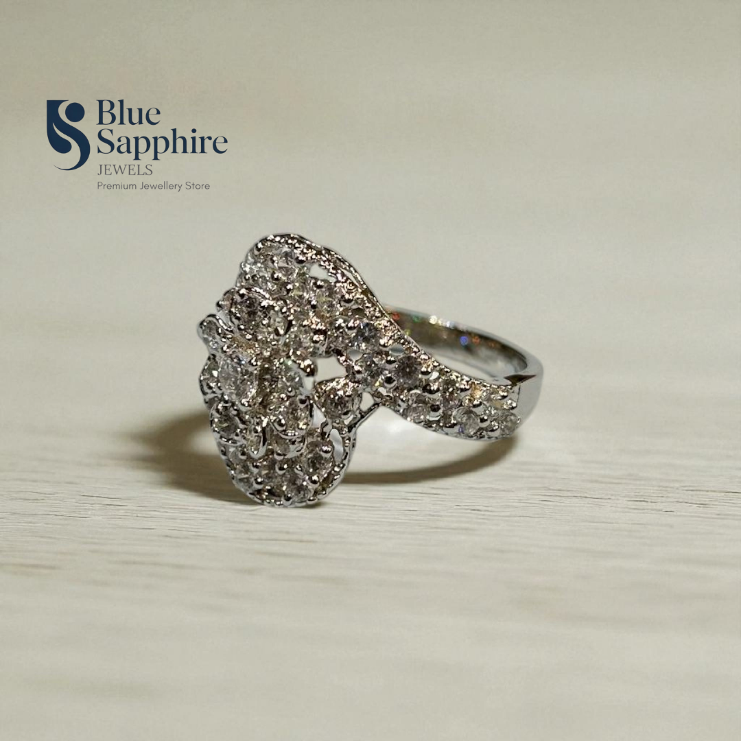 A true symbol of grace and sophistication. This exquisite 925 sterling silver ring features a stunning floral cluster design adorned with premium zircon stones that sparkle with every movement. Its intricate craftsmanship and comfortable fit make it perfect for daily elegance or special occasions. Designed to capture timeless beauty, this ring from Blue Sapphire Jewels is a must-have addition to any fine jewelry collection.