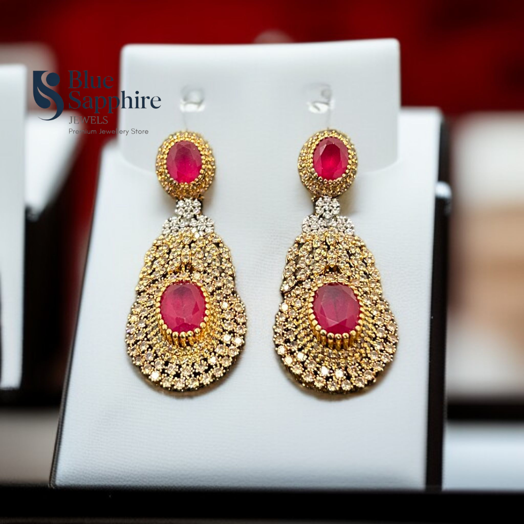 A stunning blend of royalty and modern elegance. These premium 925 sterling silver earrings feature a bold ruby-red centerpiece surrounded by layers of sparkling zircon stones, enhanced with a luxurious gold plated finish. Designed to make you stand out at weddings, parties and special events. Lightweight, comfortable and radiantly crafted, this pair from Blue Sapphire Jewels adds undeniable glamour to every look.
