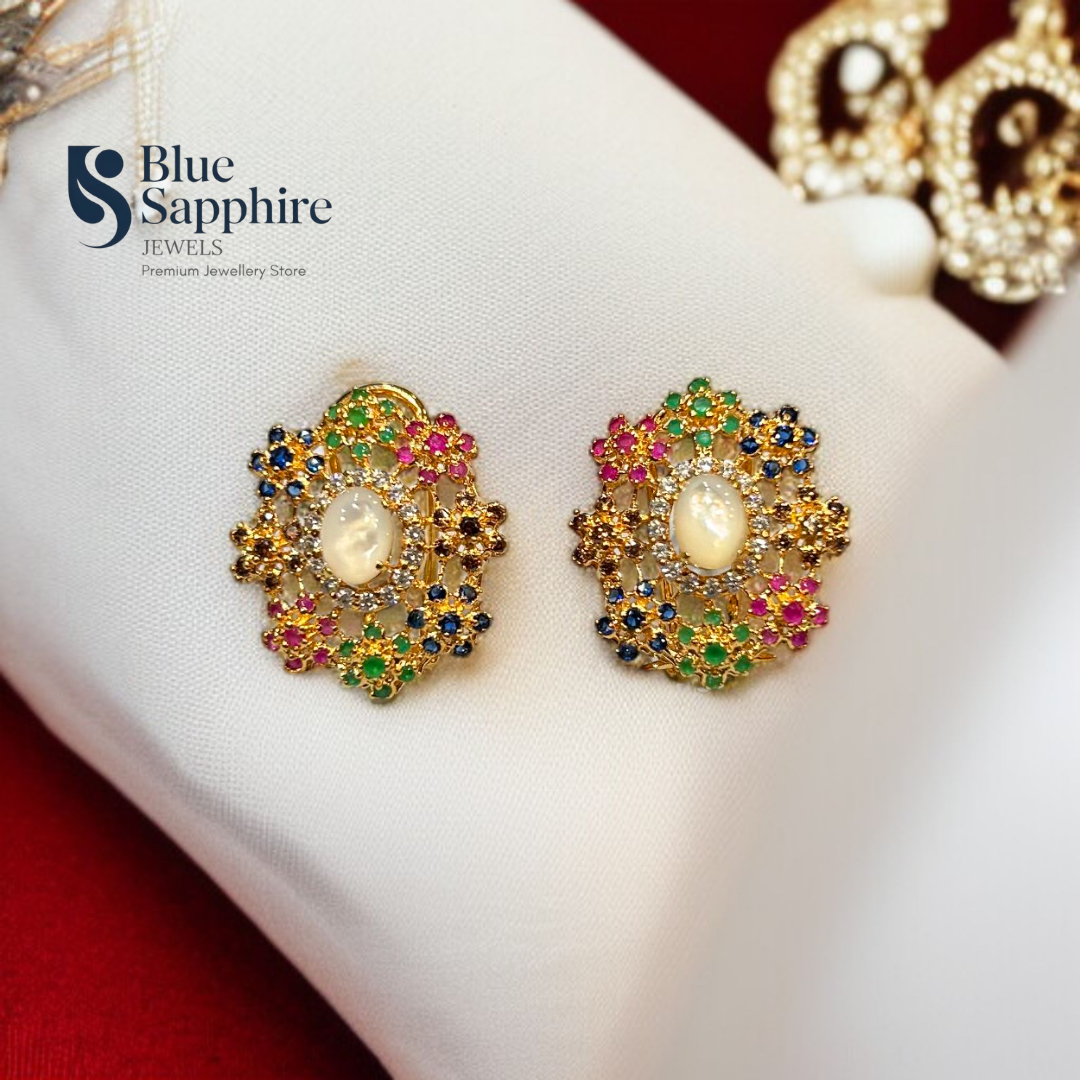 Add a touch of timeless elegance to your jewelry collection with this stunning 925 Sterling Silver Studs. Beautifully crafted with a gold-plated finish. The intricate design features multicolored zirconia stones in shades of green, pink, blue, and white, centered around an elegant oval stone for a luxurious sparkle.