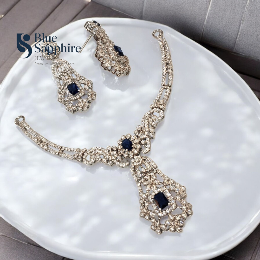 Elevate your elegance with our Regal Blue Sapphire Jewelry Set, featuring a luxurious blend of stainless steel plating over 925 sterling silver. This exquisitely crafted set includes a stunning necklace and matching earrings, both adorned with deep blue sapphire stones framed by dazzling high-grade cubic zirconia. The vintage-inspired design adds timeless charm, making it perfect for weddings, formal events, or special occasions.