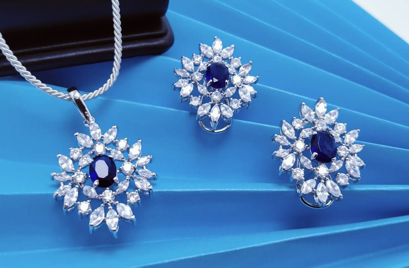 Rhodium Plated Pendant set with Blue Sapphire and Zircons.(925 Silver)