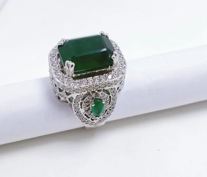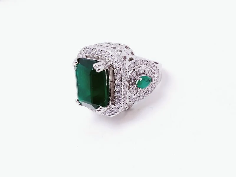 Experience the captivating beauty of this stunning ring, where the vibrant green of a synthetic emerald meets the dazzling sparkle of brilliant zircons. The lush, regal hue of the emerald-colored stone takes center stage, beautifully complemented by an array of premium quality zircons that catch every light. Expertly crafted from genuine 925 Sterling Silver and finished with a luminous Rhodium plating, this ring offers the sleek, bright white look of platinum and superior resistance to tarnish, ensuring lasting radiance.