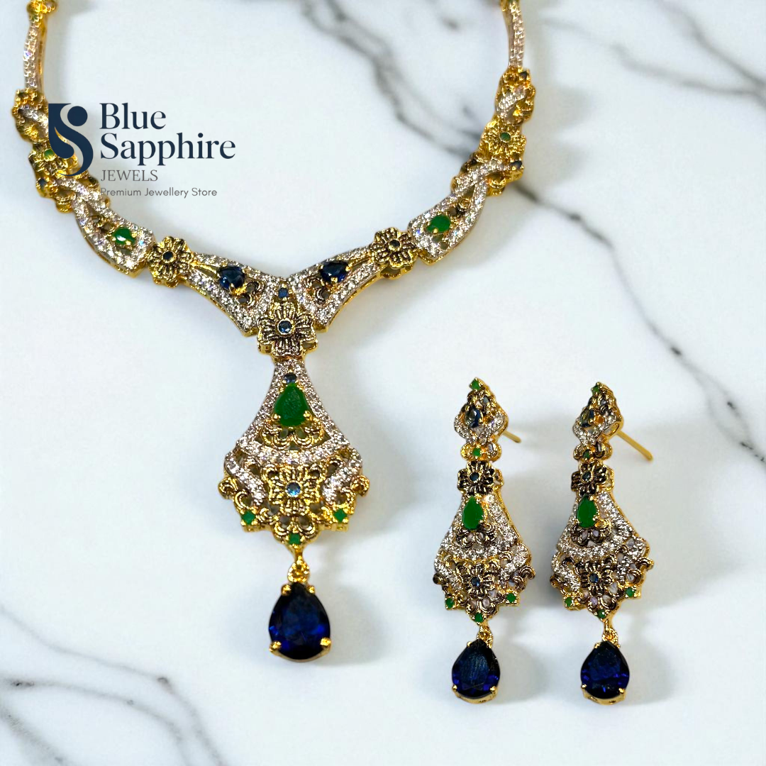 Elevate your elegance with this luxurious Royal Blue & Emerald Teardrop Necklace Set, beautifully crafted from 925 sterling silver and finished with a radiant gold plating. The intricate design showcases a stunning combination of deep blue and vibrant green gemstones, surrounded by shimmering cubic zirconia for a royal touch. Perfect for weddings, festive occasions, and evening celebrations, this exquisite set includes a statement necklace and matching drop earrings — both exuding timeless sophistication and charm.