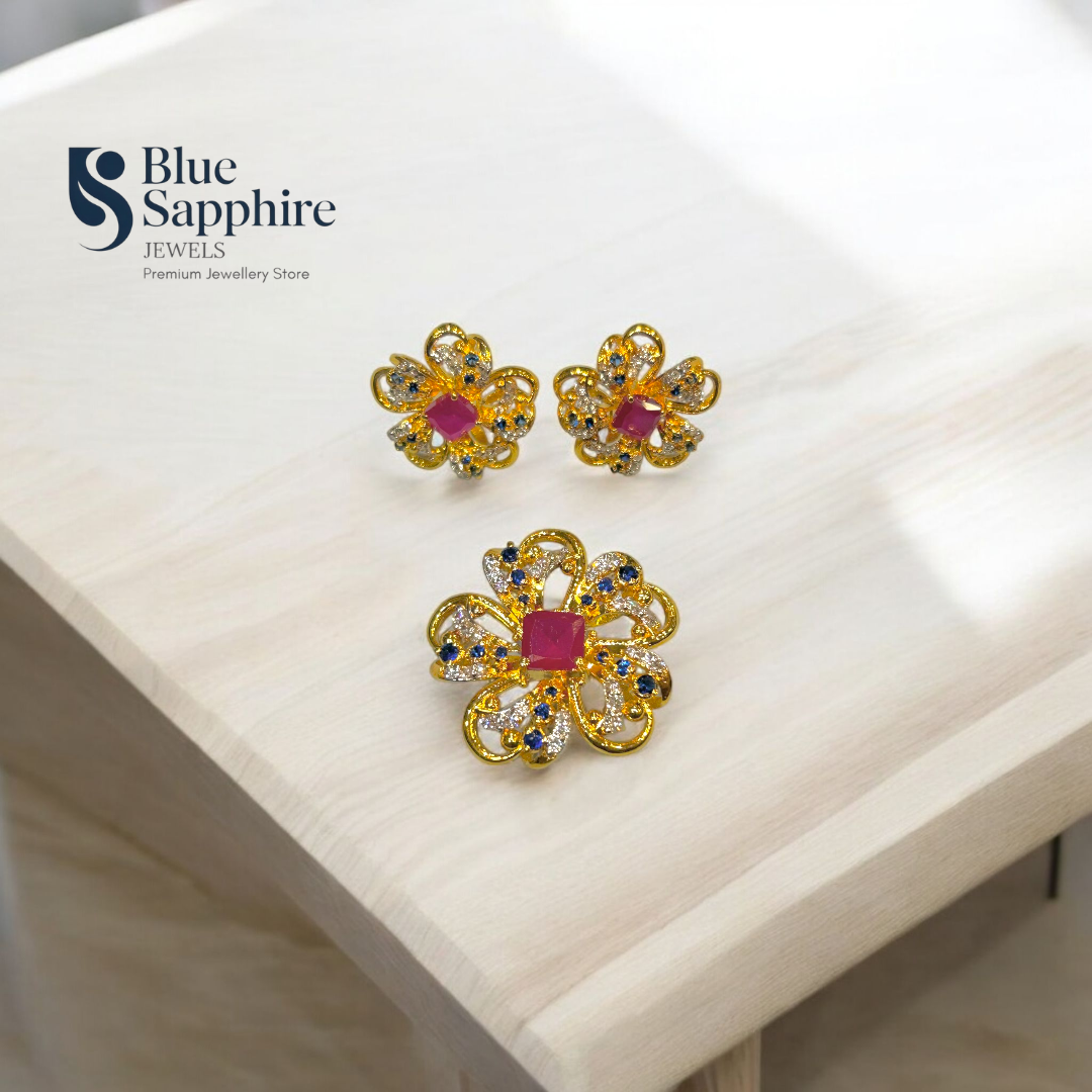 Elevate your ensemble with this statement ruby floral jewellery set, crafted in premium gold-plated 925 sterling silver. The harmonious blend of the pendant and matching earrings showcases a bold ruby-inspired centrepiece encircled by glittering white and blue stones, evoking a radiant flower in full bloom. Perfect for weddings, festive occasions, or gifting.